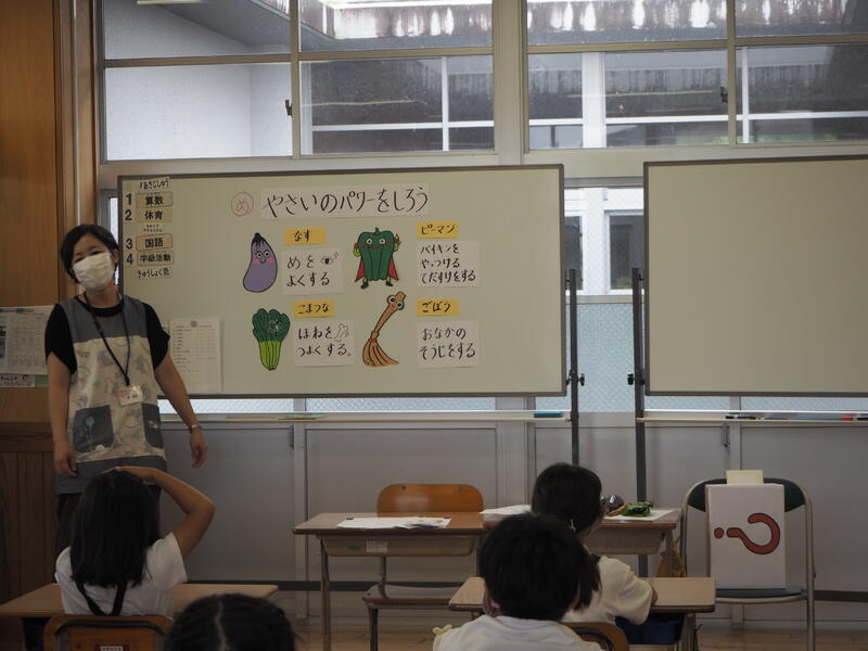 「なす、ピーマン、ごぼう、小松菜」の4種類の野菜パワーについて学習しました。