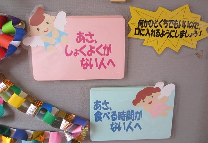 保健室に体調不良で来る人や朝からイライラしている人、そして「すまいる大作戦」の調査などで、朝ごはんを食べないで学校に来る子が、多くはおありませんが本校にもいますので、朝食をとりあげてみました。