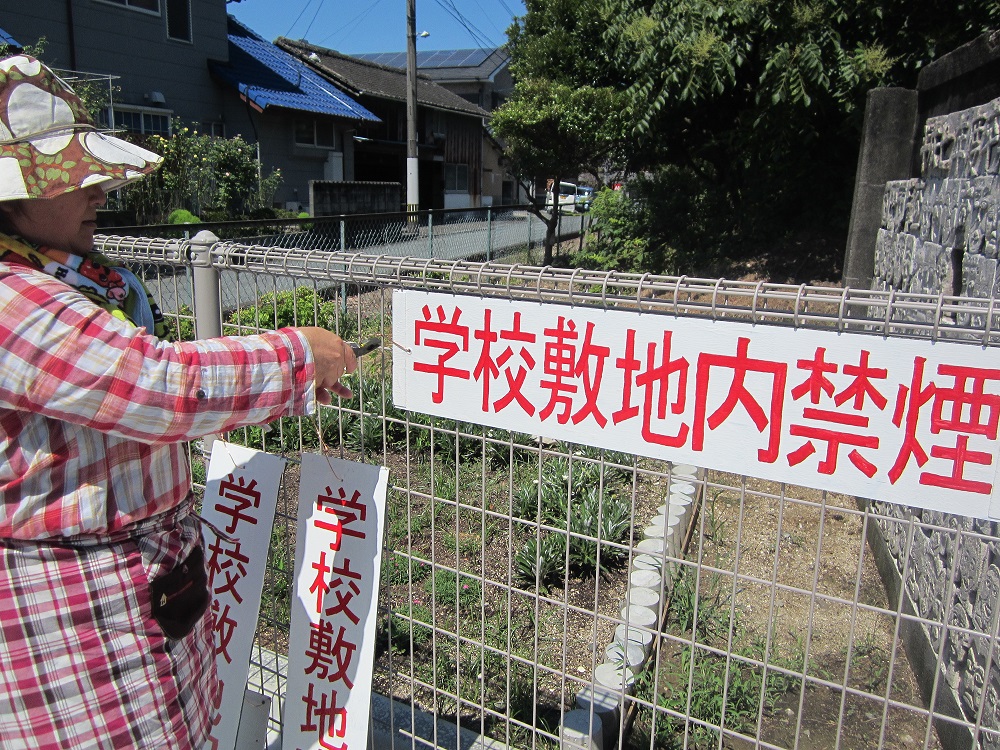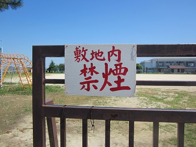 ということで、まず早速、先日完成した「敷地内禁煙」の看板を設置しました!9月末の運動会前にと思っていたので、完成してよかったです。