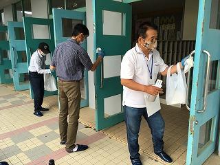 子どもたちが下校した後、水道やドア、てすりなどを消毒してもらいました。