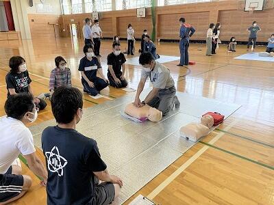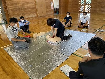 救急救命士の方が、胸骨圧迫の指導をしてくださいました。