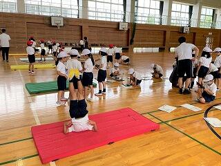 前回りや背支持倒立、川跳びなどの課題に取り組みました。