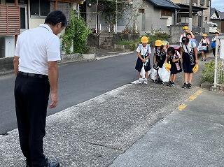 喜ぶ・デレ校長先生も校門であいさつ運動です。