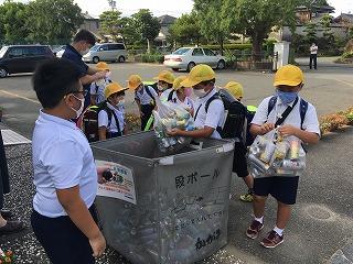 登校時、子供たちがアルミ缶を持ってきてくれます。