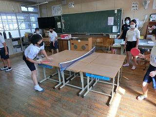 ・エアコンのある教室で、机を台にして卓球をしました。