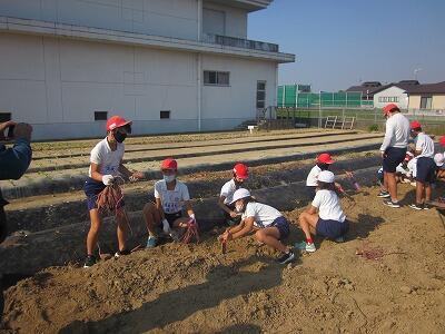 学校畑「ふれあい農園」にレタスを植えました。