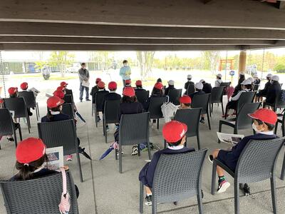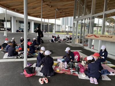 小雨なので、施設のひさしの下でお弁当を食べました。