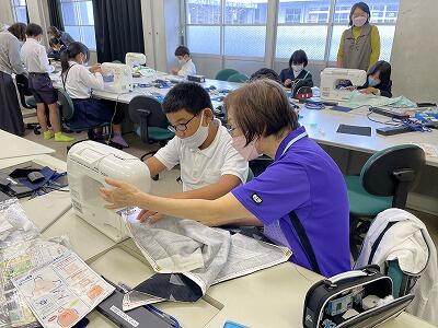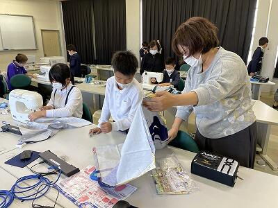 5年生が家庭科の授業で、ミシンを使った裁縫の学習をしています。