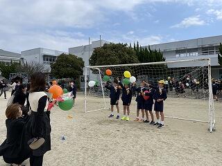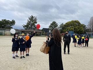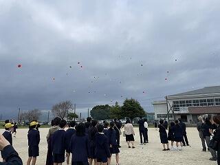 卒業の思い出に、全員が風船をもって、空に飛ばしました。