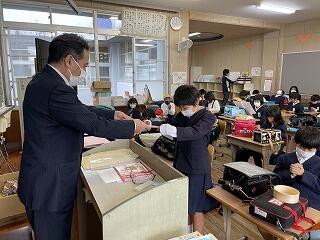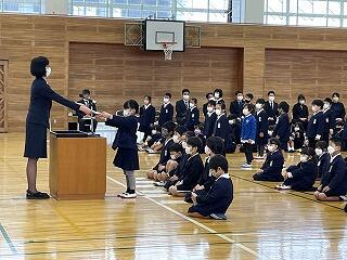 担任の先生が、一人一人子供たちに3学期のがんばりを伝え、通知表を渡しました。