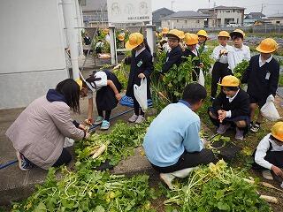5時間目、1年生が大根を収穫しました。