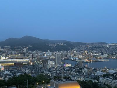 ホテルの屋上で、夜景をバックに記念写真を撮りました。