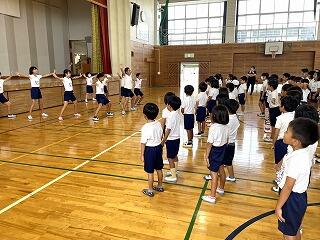 準備運動でラジオ体操第一をします。