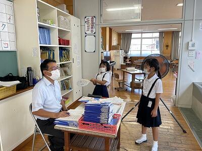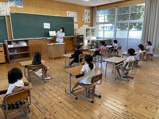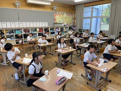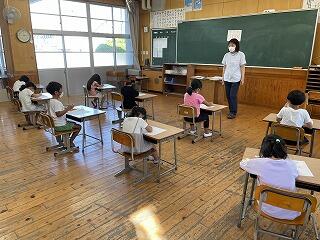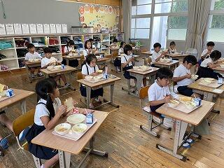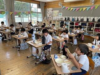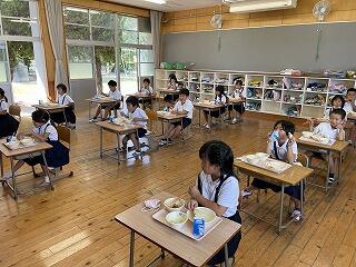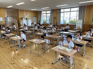 1年生は35名いますので、2つの教室に分かれて給食を食べています。16名が1年教室の児童が食べます。