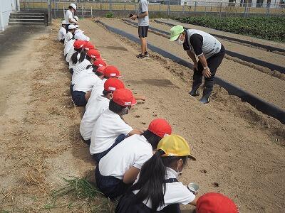 子供たちは、大根の種を穴に入れて土をかぶせました。