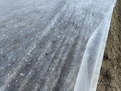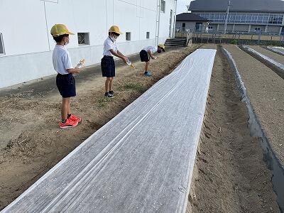 (畑が乾かないように、芽が出るまで薄いシートをかけておきます)