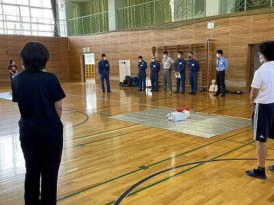 鏡消防署から6名(+お一人は研修生)来ていただき、救急救命法の研修を行いました。