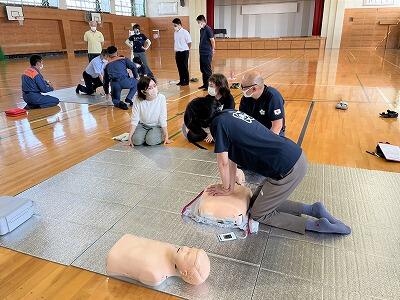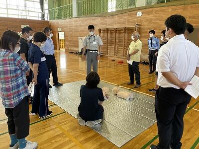 あってはなりませんが、もしもの時…に備えて、救命の研修(胸骨圧迫実践、AEDの使い方、熱中症対策)をしました。
