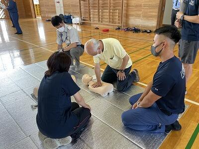 救急救命士の方が、胸骨圧迫の指導をしてくださいました。