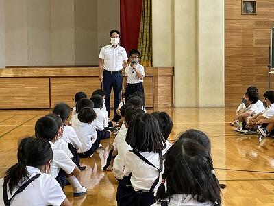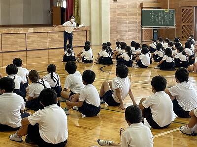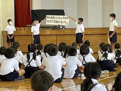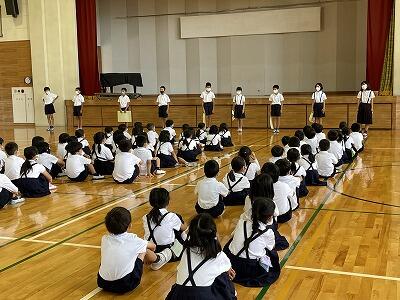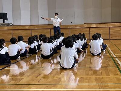 朝の時間(8時30分~45分)、体育館で全校集会をしました。