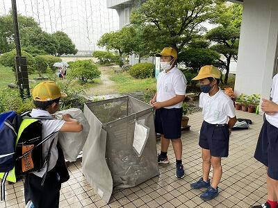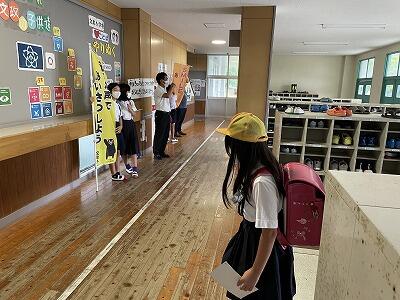 毎週水曜日は、学校玄関でアルミ缶集め、児童昇降口であいさつ運動をしています。