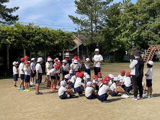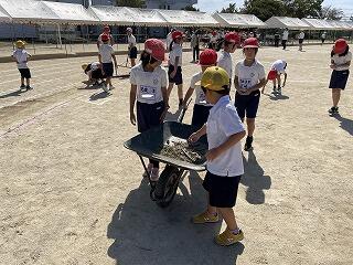 1~3年生は、運動場の石ころや枝、葉っぱなどを拾いました。