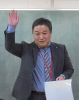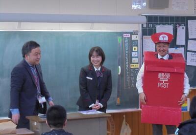 河陽郵便局長の後藤さんと県中部地区連絡会 副統括局長の渡邊さん、色見郵便局の甲斐さんをゲストティーチャー(GT)としてお迎えして、「お金の授業」をしていただきました。