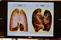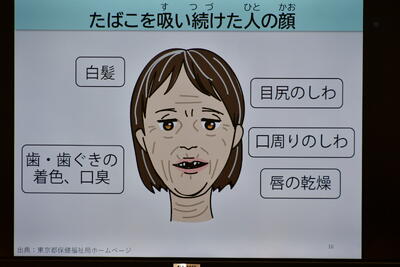 タバコを吸っていない人と吸っている人の肺や歯の違いを、スライドを使って説明していただきましたが、子どもたちからは「うぁ~!!」という驚きの声が上がっていました。