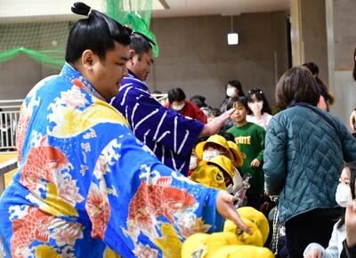 到着後、しばらく稽古や立ち会いがなかったので、暇にしていたところ、2人のお相撲さんが来てくださって、子どもたちと交流をしていただきました。