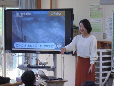 始めに、防災WESTの方から洪水が起こるしくみを画像や動画を交えて、わかりやすく説明していただきました。