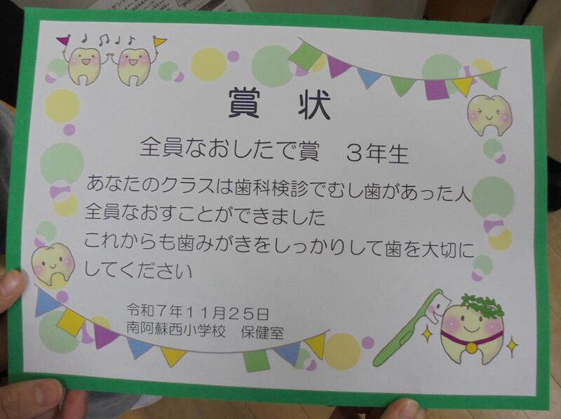 すると、3年生が全員、歯の治療が終わりましたので、「全員なおしたで賞」の賞状を届けに行きました。