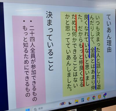 この時間では、「合意形成」までは行きませんでしたが、子どもたちが真剣に話し合う姿が見られました。