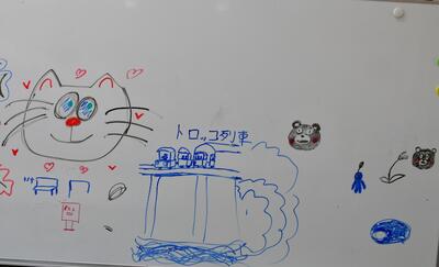 交流会の会場では、子どもたちが書いたホワイトボードアートでお出迎えをしました。