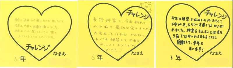 今月の「チャレンジ&スマイルカード」の紹介は、10月24日に行われた長野神楽で神楽を舞った子どもたちの「チャレンジカード」を紹介しました。
