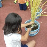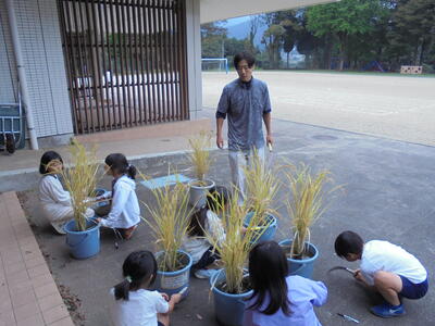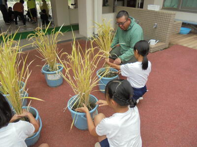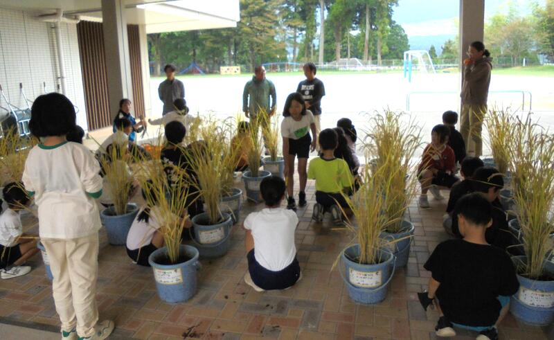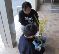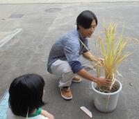 JA青壮年部の北野さん、村上さん、長野さんに来ていただき、バケツ稲の収穫をしました。