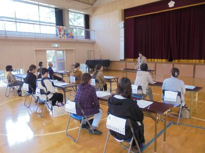 その時間に、保護者の皆様には、就学時健診の趣旨や特別支援教育について、担当者から説明がありました。現1年生担任から、入学に向けての物品等の準備についても説明があり、熱心に聞かれていました。