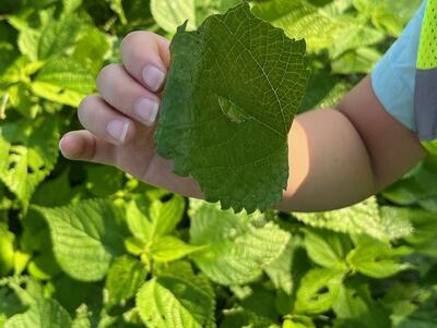 登校班のメンバーが集まるまで、葉っぱで遊んでいる子がいました。