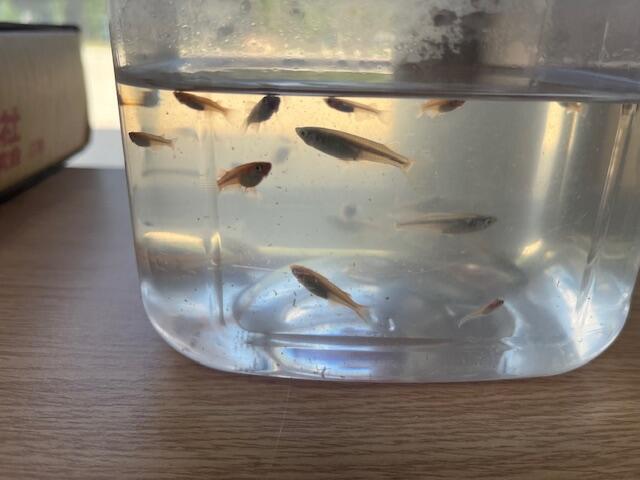 さっそく、理科室の水槽に入れられたグッピーは、メダカと一緒に気持ちよく泳いでいました。