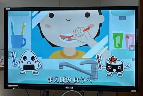 それでは、電子黒板に映っているアニメーションと音楽に合わせて、ハミガキをしましょう!