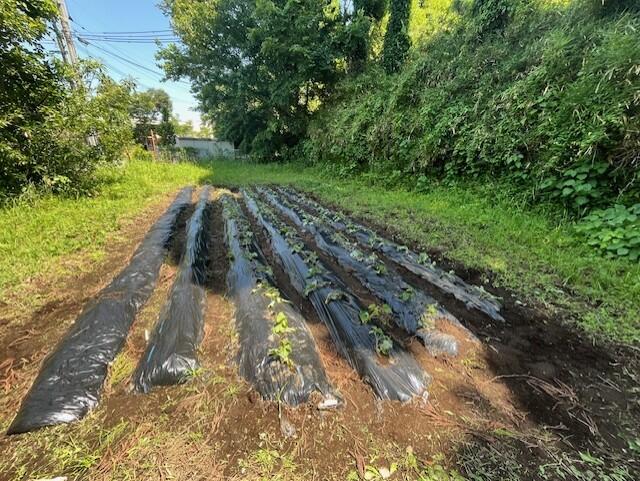 ビニールシートの両端を引っ張って、畝にかぶせて、両脇に土をかぶせます。