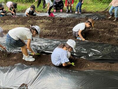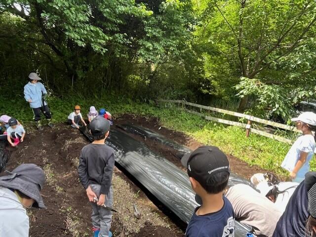 2年生は、畝を作って、ビニールシートを畝に貼る作業から始まりました。