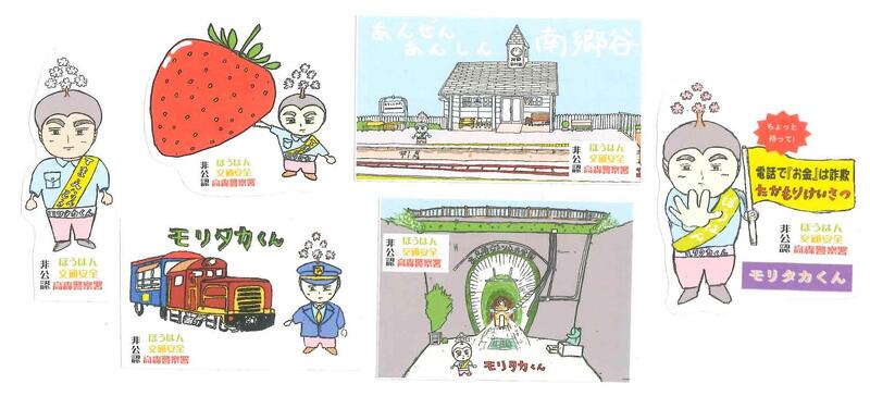 昨年度の交通教室で配付された、非公認 高森警察署「もりたかくん」のシールがバージョンアップされていましたので、そのラインナップを紹介します。