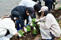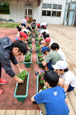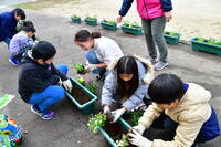 正門前の花壇に、みんなで協力して植えることができました。