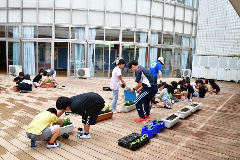 業間に全校で花植えをしました。春の花のパンジーやビオラから、夏の花のマリーゴールドやサルビア、ニチニチソウ、ポーチュラカなどに植え替えられました。