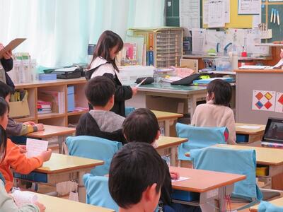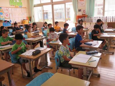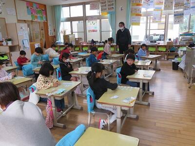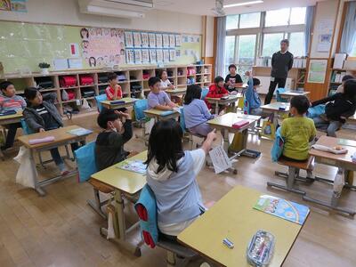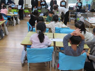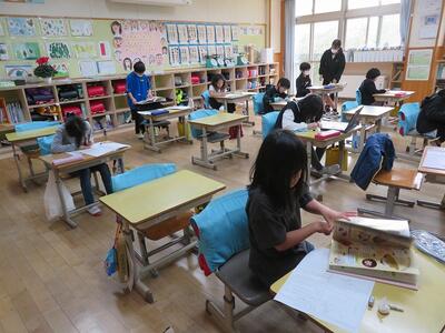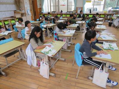 1時間目の授業、1年生は国語、説明文「うみのかくれんぼ」を学習し、学んだことを活かして「いきものずかん」を作っていました。