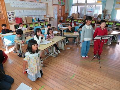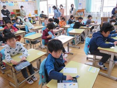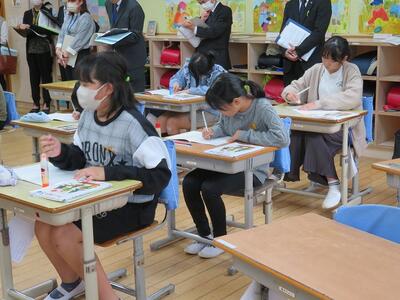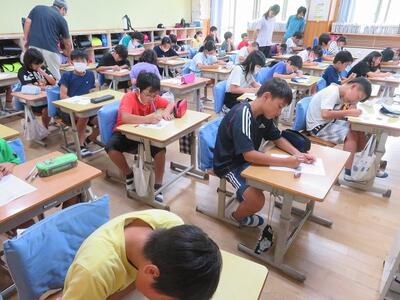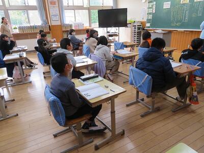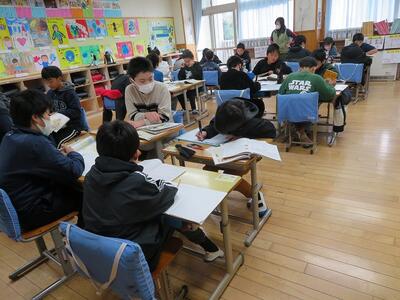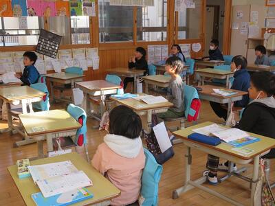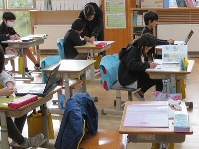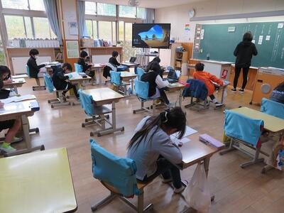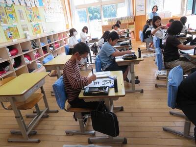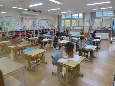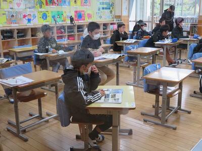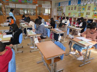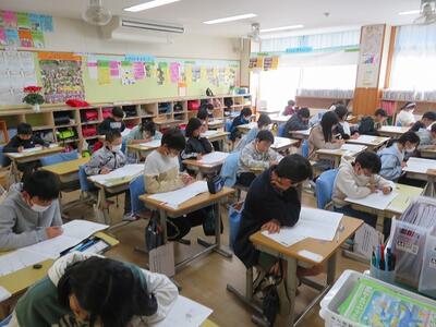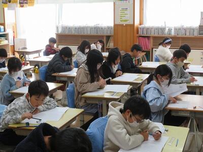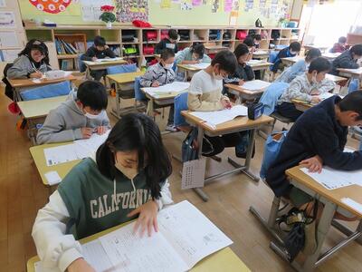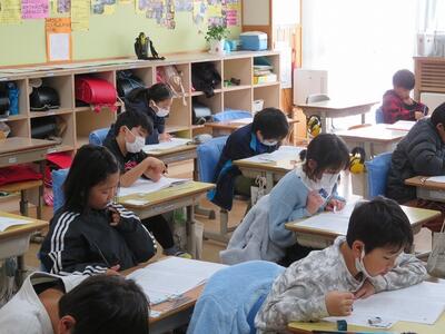 今日の2時間目、2年生から6年生は村や県の学力テスト(国語)に取り組みました。明日は、算数です。