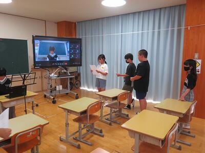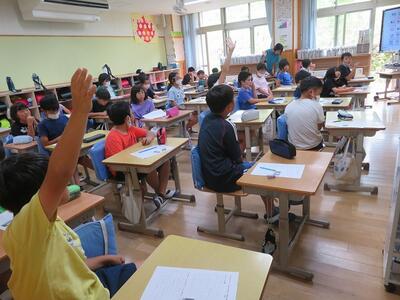 同じく昨日の5時間目、4年生の総合でも、ゲストティーチャーから学びました。「6.26白川大水害」について、南阿蘇村に住んでおられた田上さん(みゆさんのおじいちゃん)から当時の様子を聞き取りしました。この日のため、現在お住まいの熊本市から来ていただきました。
