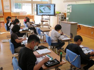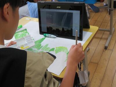 3時間目、6年生の図工は風景画。タブレットで撮った写真を見ながら描いていました。撮った写真は、構図が工夫されていました。遠近感や奥行きが分かるような絵を描いていました。