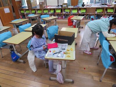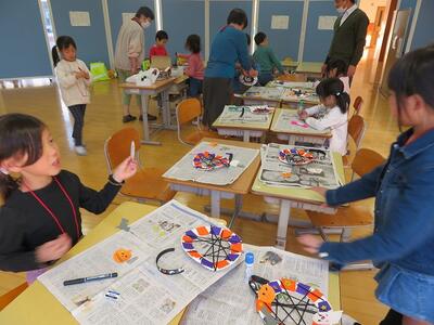 科学展発明工夫展に出品した子どもたちは、運動会期間中も理科専科の北先生と一緒に、朝の時間や昼休み、また、家に持ち帰ってお家の方の協力を得ながら作品を仕上げました。