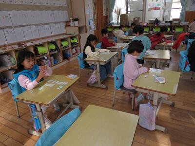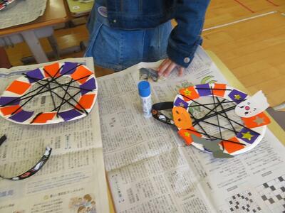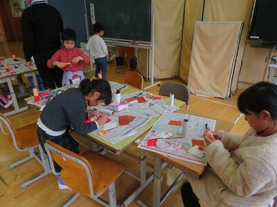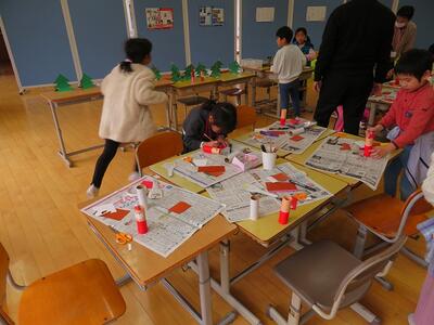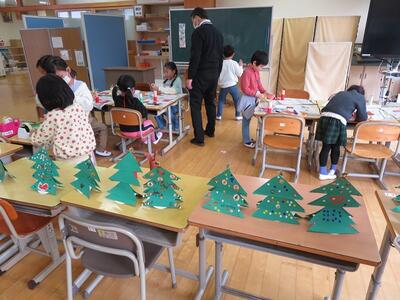 放課後、久しぶりに1年生の放課後子ども教室が行われました。紙のクリスマスツリーやサンタさんを作っていました。